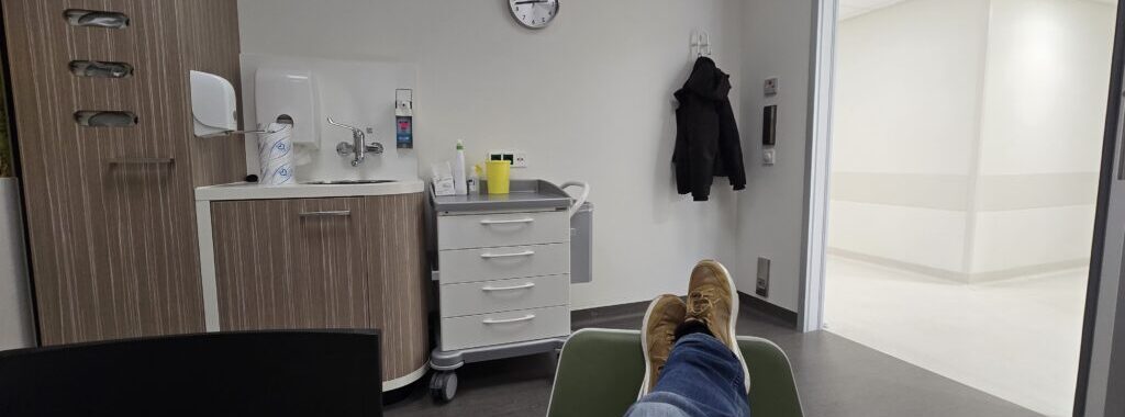 Omdat het radioactieve stofje anderhalf uur in moet werken, zit ik die gehele tijd lekker ‘ontspannen’ te luisteren naar mannen die in andere toedieningskamers in geuren en kleuren vertellen hoe ze alles beleven.